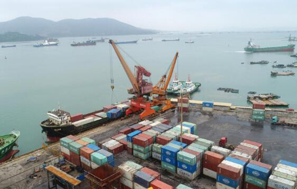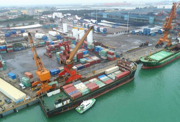 4月20日下午,记者来到阳江港码头,只见码头上的起重机将一个个集装箱起吊到货轮上,运货车辆在码头与货场间来回穿梭,一派热火朝天的作业场面。宋福亮 摄影报道